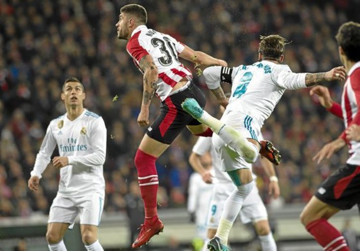 San Mamés, aunque no llegó a llenarse, respondió con bullicio porque este rival les pone a los aficionados. El partido comenzó con el Madrid presionando arriba y dificultando la salida del balón del Athletic. Así, tras una recuperación en el centro de campo, llegó en el minuto 7 el primer susto con un disparo al palo de Benzema. No se arrugaron los rojiblancos y un cabezazo de Aduriz obligó a estrenarse a Navas. Respondieron los merengues con otro par de llegadas que fueron atajadas por Kepa.