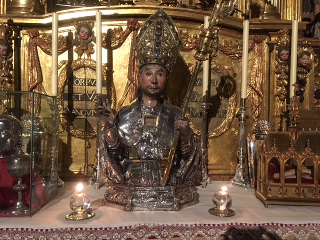 Ese hueso fue colocado en el busto guarnecido de plata de 1527 en el que se puede ver hoy en día, aunque fue transformado en el siglo XVIII. En concreto, ese fragmento es visible en el pecho de la imagen.