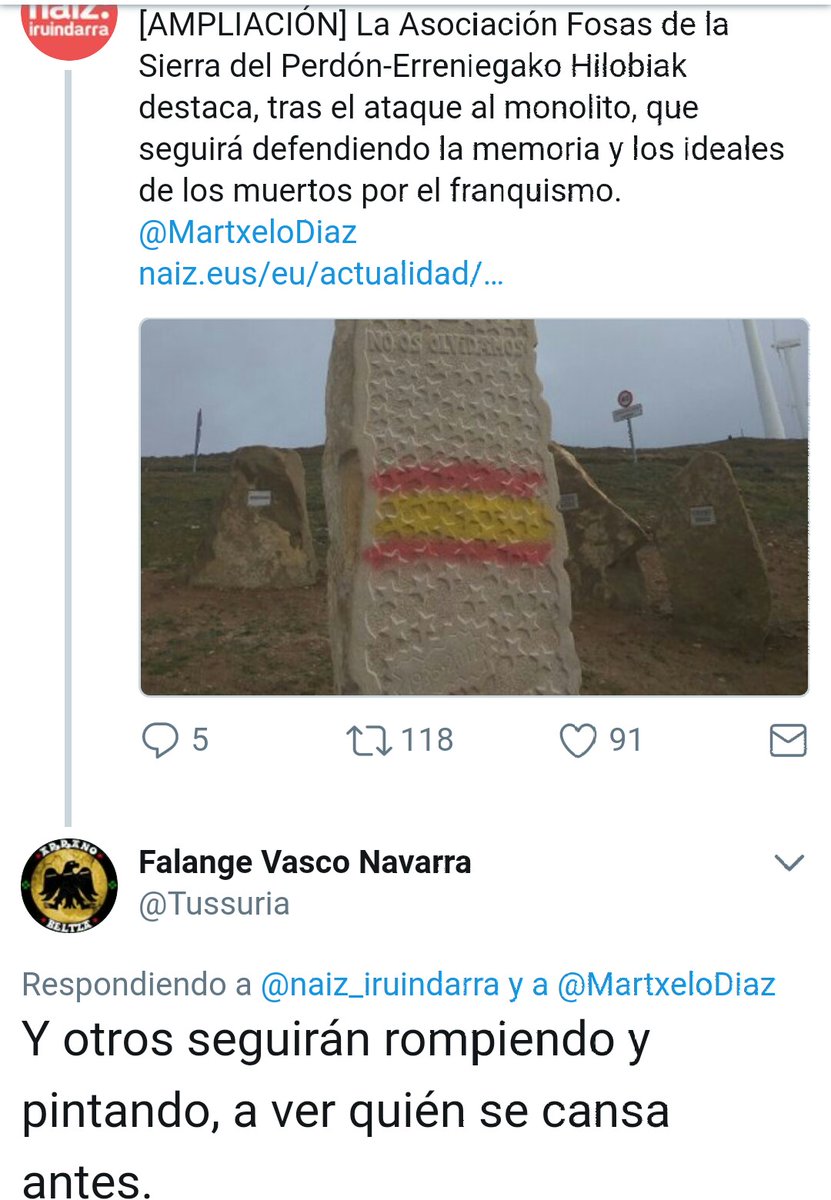 Preguntado por si tienen sospechas sobre la autoría de estos ataques, Train ha recordado que Falange Vasco-Navarra publicó un tweet en el que señalaba que «unos rompen y pintan [mientras otros reparan los daños] y a ver quién se cansa antes».