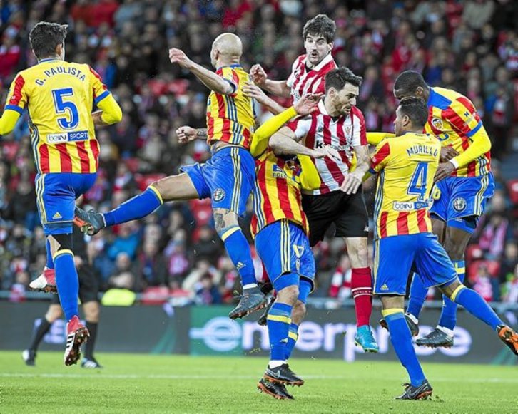 Los continuos parones en el juego, con Aduriz y Raúl más en el suelo que al juego, favorecían esa ruptura del juego combinativo que proponían los de Marcelino García Toral. La iniciativa se equilibró hasta sobrepasada la media hora en que Kondogbia abrió a banda, San José y Beñat en lugar de defender al francés se hundieron hasta el área grande de Kepa y el pase lateral llegó al propio valencianista que, clamorosamente solo, desde la media luna acarició de lujo el esférico para hacer imposible la estirada del de Ondarroa. Error, nuevo, de marca, y a remolque.