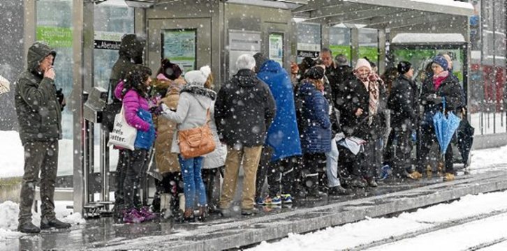 A la vista de cómo se presentaba el día no es de extrañar que muchos echasen mano del transporte público para moverse por la ciudad. Quienes optaron por el autobús tuvieron que tomárselo con calma, y aceptar que cuando nieva no se puede exigir puntualidad. Y quienes eligieron el tranvía tuvieron que viajar en convoyes saturados. Seguro que algún estudiante realizó al trayecto hasta el campus enlatado, ajeno a que la UPV-EHU decidió suspender las clases hasta la tarde.