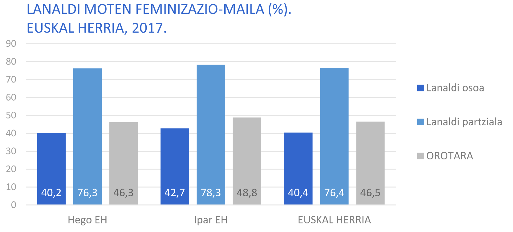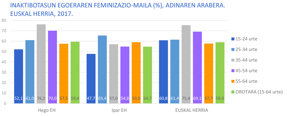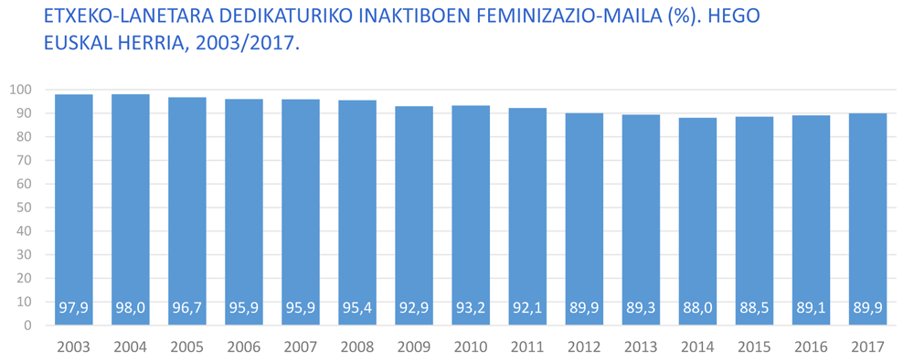 Gaindegia precisa que a pesar de que faltan encuestas para conocer con detalle la realidad de todo Euskal Herria, el 89,9% de personas «inactivas» que se dedican a las tareas domésticas son mujeres, en base a los datos oficiales. Esa tendencia se está moderando lentamente y en la última década ha bajado unos cinco puntos. Sin embargo, desde 2015, como consecuencia de la recuperación económica, esa tendencia se ha detenido y la feminización de la inactividad ligada a las tareas de casa está repuntando de nuevo.