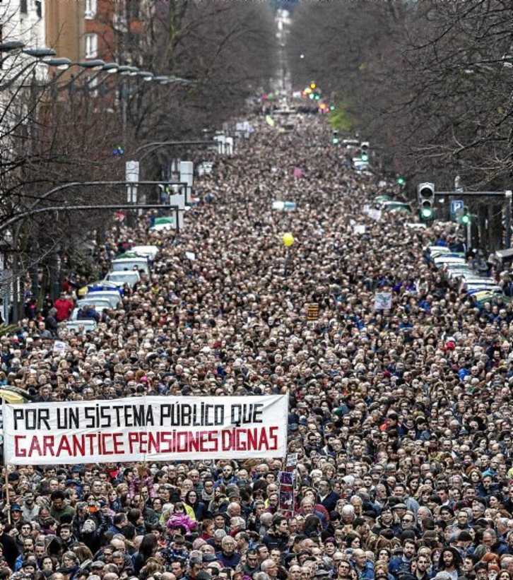 No fueron una ni dos grandes manifestaciones, las cuatro capitales de Hego Euskal Herria y municipios como Tafalla y Tutera dejaron ayer imágenes de movilizaciones multitudinarias que reunieron a pensionistas actuales y futuros de muy diversas ideologías con un mensaje unánime: «ni un paso atrás» en la lucha por un sistema público que garantice pensiones dignas a todas las personas. Un rotundo «no» a lo que consideran un insultante incremento del 0,25%, que se ha convertido en la gota que colma el vaso tras años de hartazgo, silencio y quejas en el ámbito privado que han pasado a articular una lucha en las calles que ayer exhibió músculo en todos los herrialdes con protestas multitudinarias y transversales en todos los sentidos.