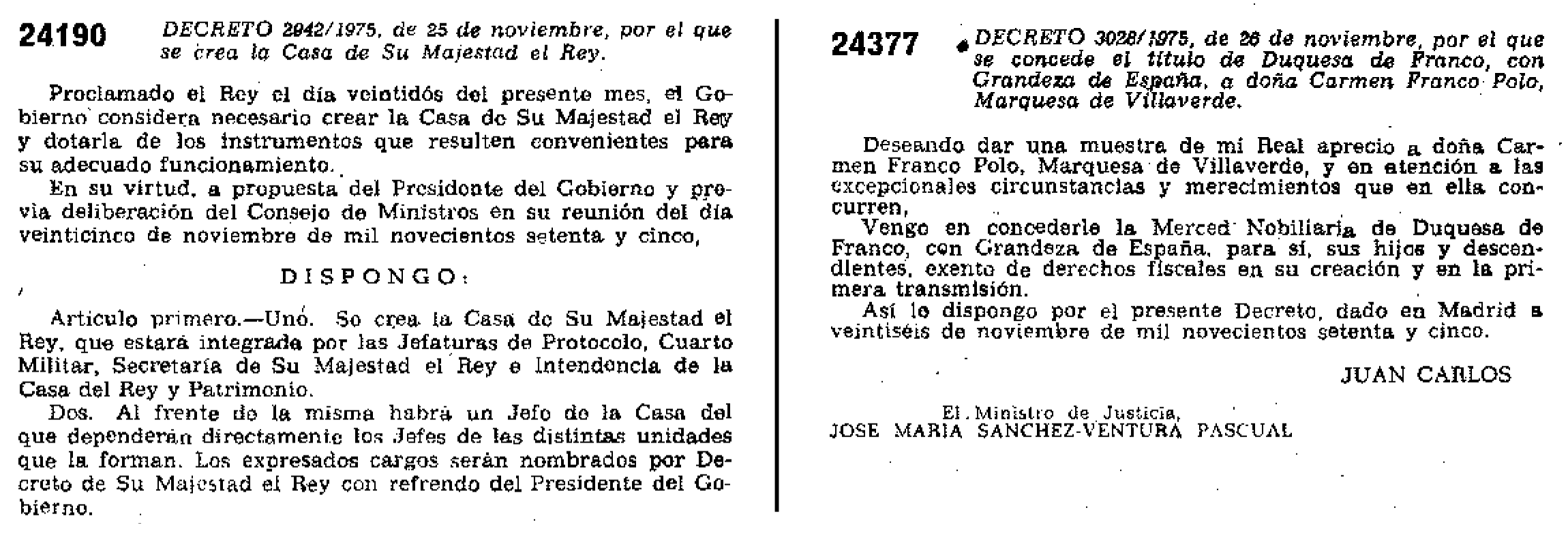 Juan Carlos de Borbón fue nombrado rey el 22 de noviembre de 1975, el BOE publicó el 26 de ese mismo mes la decisión de crear la «Casa de Su Majestad el Rey» y al día siguiente, el 27 de noviembre, el BOE dio cuenta de la concesión del título de Duquesa de Franco, con Grandeza de España, a Carmen Franco Polo, «deseando dar una muestra de mi Real aprecio» y «en atención a las excepcionales circuntanscias y merecimientos que en ella concurren».