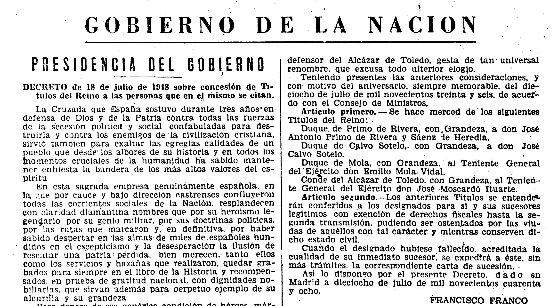 Franco comenzó a otorgar títulos nobiliarios en 1948. El decreto de la época resumía de esta manera la razón de estos «honores»: