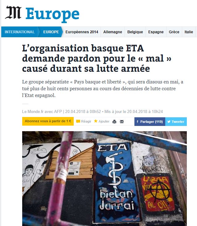 El comunicado en el que la organización reconoce el daño causado ha tenido una gran repercusión tanto en Euskal Herria como fuera de estas fronteras. Numerosos medios internacionales han recogido la noticia en sus ediciones digitales.