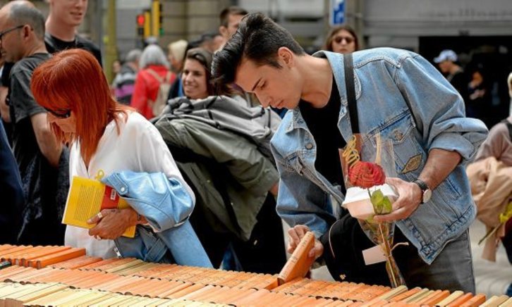 Pero empecemos por libreros y editores. Para hacernos una idea de lo que supone Sant Jordi para la producción cultural catalana, imaginémonos una Durangoko Azoka, pero concentrada en una sola jornada y con un universo lingüístico de casi diez millones de hablantes. Eso sin tener en cuenta la inmensa cantidad de libros que se venden en castellano. Vaya el primer recuerdo, por tanto, para los sacrificados libreros, que se juegan una parte nada despreciable de los resultados del año en una sola jornada –en 2017 se facturaron 21,8 millones de euros por la venta de libros–. A tenor de las primeras valoraciones escuchadas ayer, no será un mal año.