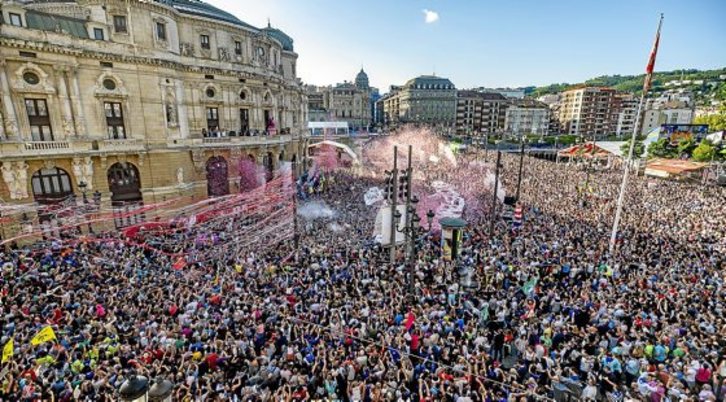 Escasos segundos tardó la otra protagonista de la tarde en encender su primer txupin, que poco después detonó en el cielo. Para entonces asomó por la vetana, brazos en alto, la musa de Aste Nagusia, que sonriente empujó a los pocos que aún no se había entregado a la fiesta. A los sones del pegadizo ‘‘Badator Marijaia’’, villanos y foráneos dieron rienda suelta a sus ganas de fiesta, que de eso se trataba.