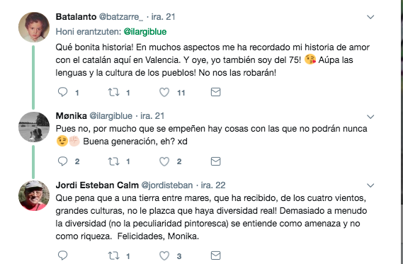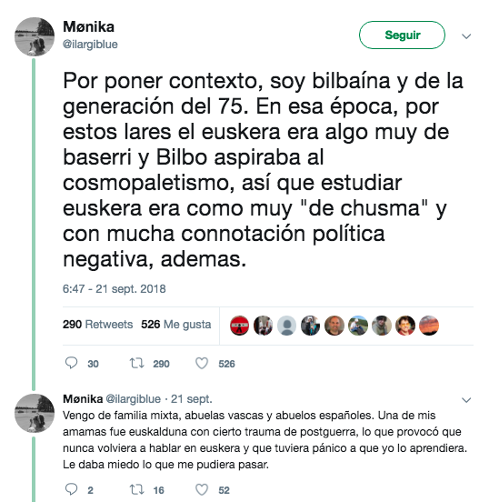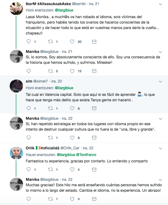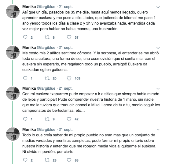 Mónica, una bilbaína de 43 años, empleaba Twitter para relatar su historia con el euskara, donde se lamenta de que al negarle el euskara le robaron media vida. «Al comprender el euskara se me abrió toda una cultura, una forma de ser, una cosmovisión que si sentía mía», asegura.