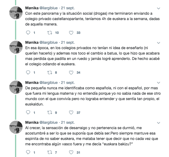 En el hilo, Mónica se lamenta de que al negarle el euskara le robaron media vida.