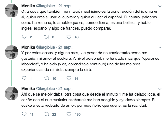 La sorpresa llegó de la mano del euskaltegi, ya que nada más empezar a comprender el euskara «se me abrió toda una cultura, una forma de ser, una cosmovisión que si sentía mía, con el euskara sin esperarlo, me regalaron todo un pueblo, arraigo!! Euskara da euskadun egiten gaituena», asegura en su hilo de Twitter.