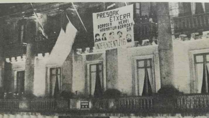 Alas doce en punto de la noche se izó la bandera de San Sebastián estallando la alegría. Sonó la tamborrada y todos los donostiarras entonaron el himno de Sarriegui. En el balcón del Ayuntamiento presidió la ikurriña. La bandera española, minutos antes, cayó al suelo: alguien cortó la cuerda. Se oían gritos de ‘ikurriña bai, española ez’ y ‘presoak etxera’». Es el escueto texto que acompaña la foto de portada del “Egin” del 20 de enero de 1979. En la imagen, la bandera de la ciudad totalmente extendida en el balcón principal de la Biblioteca Municipal y flanqueada por la ikurriña y la rojigualda, que no llegaría a medianoche.