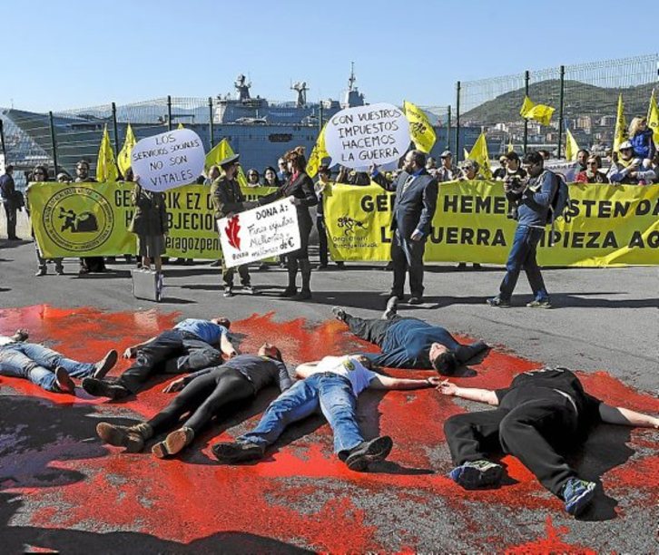 Los concentrados defendieron que «no hay misión de paz en un buque guerra» ya que «si no estarían salvando vidas en el Mediterráneo en lugar de despilfarrar dinero jugando a la guerra» en maniobras y ejercicios como en los que ha participado el portaaviones que ha hecho escala en Getxo. Añadieron que, en 2019, el Estado español gastará más de 31.800 millones de euros en diferentes partidas destinadas al militarismo, lo que suponen más de 700 euros por persona. Por todo ello, reivindicaron una vez más la objeción fiscal al gasto militar.