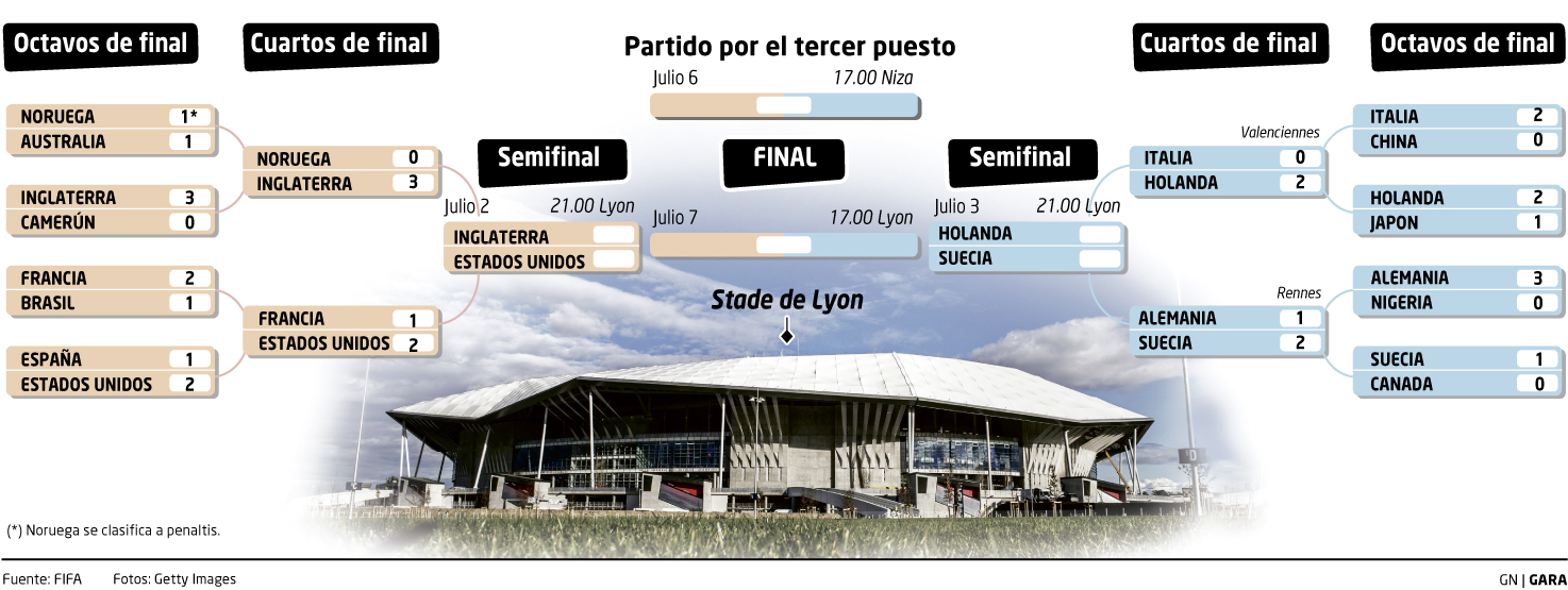 El Mundial se toma un respiro de un par de días. El martes, el Groupama Stadium de Lyon acoge la semifinal entre Inglaterra y Estados Unidos (21.00). Un día después, a la misma hora y en el mismo escenario, serán Holanda y Suecia las que peleen por una plaza en la final.