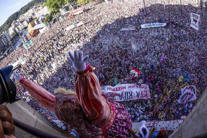 Poco después, se disparó el txupin y al detonar en el cielo azul las ansias de fiesta explotaron en un Arenal a reventar al que se asomó con los brazos en alto la musa de Aste Nagusia. Al son de ‘‘Badator Marijaia’’, la multitud comenzó a saltar y bailar si había una pequeña parte que aún no lo había hecho en los prolegómenos.