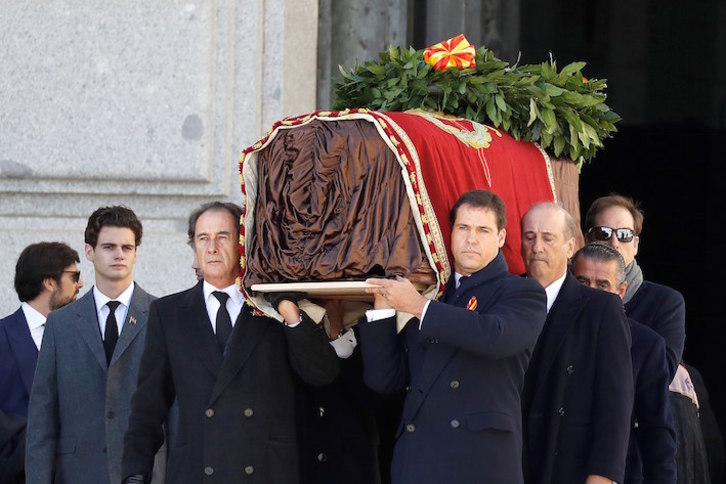 Sobre las 12.55, el ataúd ha sido trasladado en el coche fúnebre hasta uno de los aparcamientos del Valle de los Caídos y allí ha sido introducido en un helicóptero del Ejército para ser trasladado al cementerio de Mingorrubio, donde estaba previsto que fuera enterrado junto a su mujer, Carmen Polo.