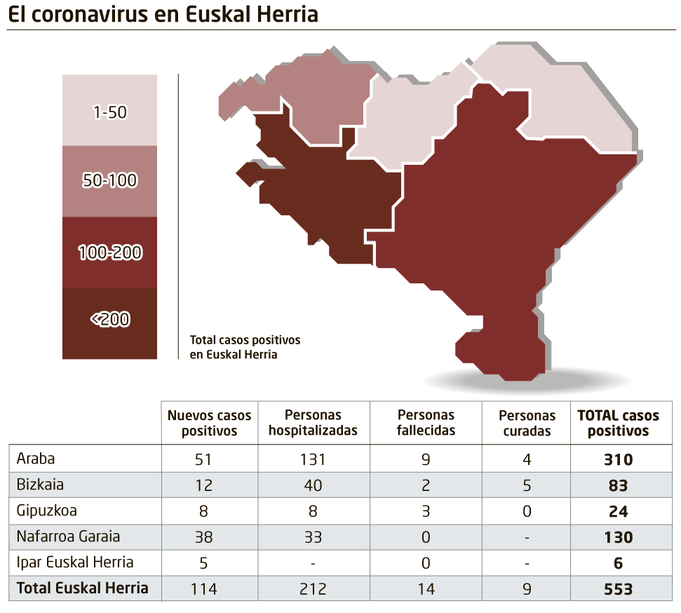 Hiru lagun zendu dira Araban azken orduetan, koronabirusarekin lotuta, Lakuak jakinarazi duenez. Krisia Euskal Herrira iritsi zenetik, 14 dira hildako pertsonak. Guztira 553 kasu atzeman dira, 209 lagun daude ospitale ezberdinetan eta bederatzik dagoeneko gainditu dute gaixotasuna.