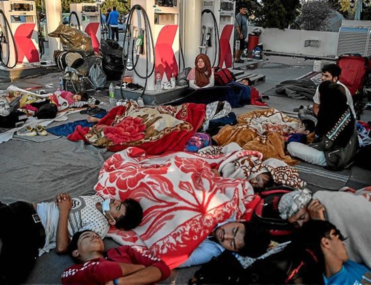 Desde Moria, Mario López Alba, responsable del programa de Salud Mental de Médicos Sin Fronteras (MSF) en Lesbos, atiende telefónicamente a GARA para denunciar la crisis humanitaria que se está viviendo en esta isla griega tras los incendios que han consumido el mayor campamento de refugiados de Europa. Miles de personas, entre 10.000 y 12.000, de ellas 6.000 menores de edad, llevan tres días durmiendo en plena calle, en carreteras, gasolineras –como se aprecia en la imagen de la derecha–, donde pueden. López Alba insta a aprovechar «este desafío para demostrar que Europa puede ser un lugar diferente» y reclama una respuesta «humana, rápida y eficaz» para atender la crisis.