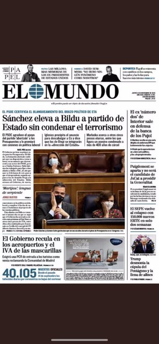 ‘El Mundo’, por contra, se ha ido al otro extremo: de lo grotesco a lo solemne. Para su titular de portada, el Gobierno español ha convertido a EH Bildu en «partido de Estado». ¿Quizás con una intencionalidad añadida de meter cizaña en el independentismo de izquierdas? Una «boutade» en cualquier caso.