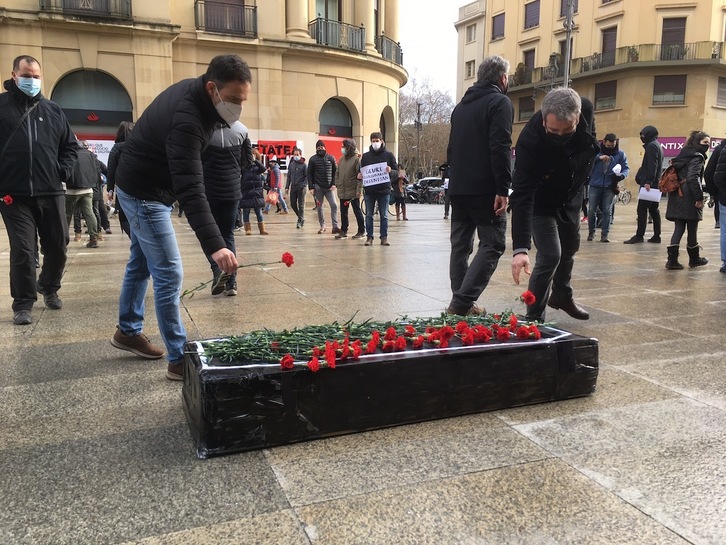 Tras recorrer el paseo de Sarasate, han accedido a la avenida de Carlos III para situarse ante la entrada del Palacio de Diputación. Delante de ella han colocado el ataúd, en el que los asistentes han ido depositando sus claveles.