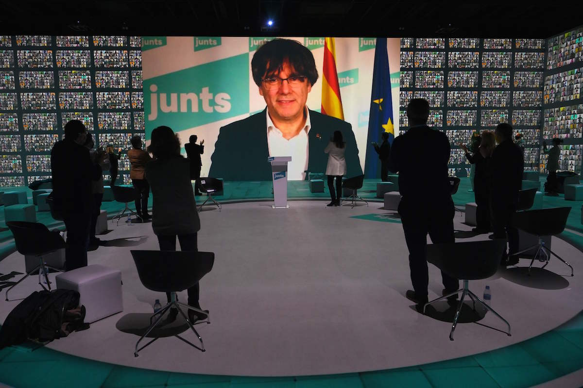 Quien fue su president en el procés y ahora exiliado, Carles Puigdemont, ha intervenido telemáticamente en el cierre de campaña de Junts en Barcelona, ante la candidata a presidir el Govern, Laura Borràs; el secretario general del partido, Jordi Sànchez; y el resto de presos de Junts; exconsellers como Lluís Puig, Toni Comín y Meritxell Borràs, y los cabezas de lista de las demarcaciones.