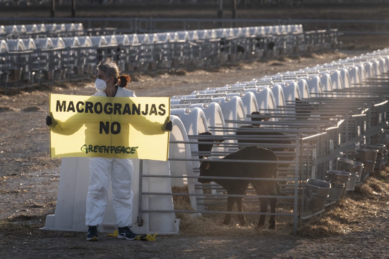 Al mismo tiempo, otro grupo de activistas de Greenpeace «ha protestado junto a las minúsculas casetas donde se encierra, sin apenas movilidad, a centenares de terneras separadas de sus madres para, en el futuro, reemplazarlas en esta fábrica de producción industrial».
