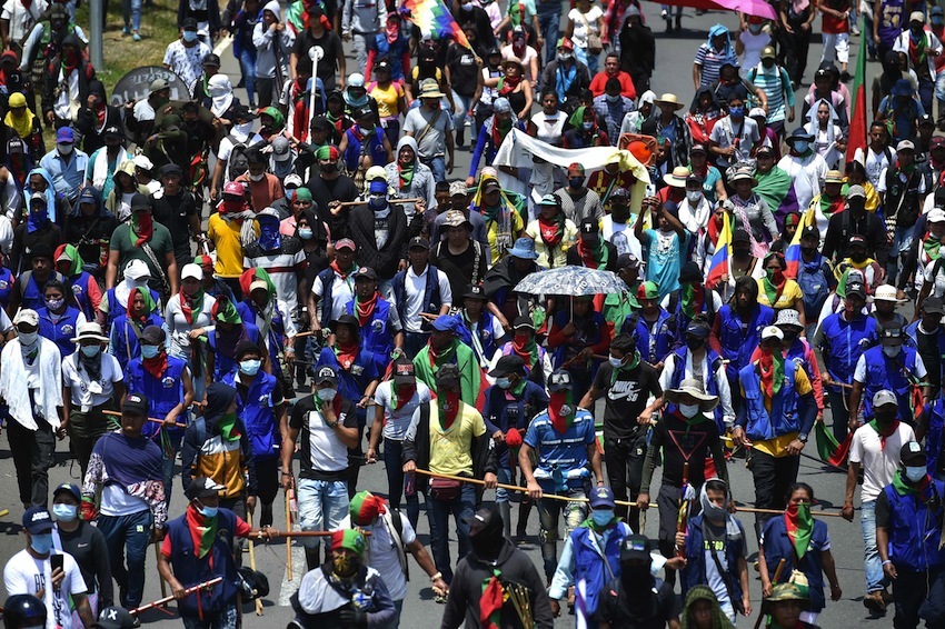 Las multitudinarias marchas han arrancado a media mañana (tarde en Euskal Herria) en Bogotá, Barranquilla, Bucaramanga, Cali y otras capitales regionales en medio de cánticos, música, banderas de Colombia y blancas. «No más impuestos», «Salud y educación», «Nos están matando a punta de hambre» se leía en algunos carteles que mostraban grupos de manifestantes en Suba, una de las localidades más grandes de Bogotá.