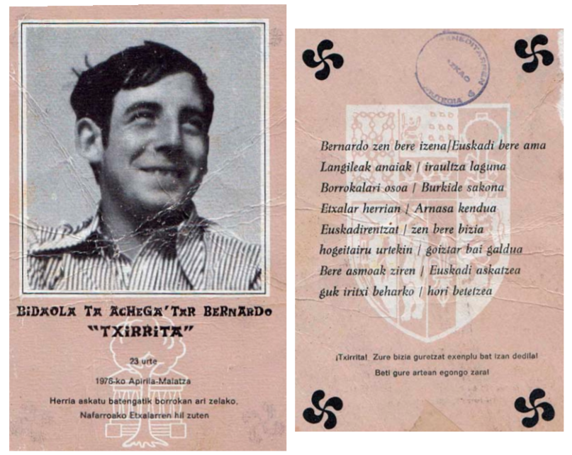 En la mañana del 25 de abril de 1976 un comando de ETA polimili se cruzó con una patrulla de la Guardia Civil en un punto de la muga entre Sara y Etxalar. Dos de los miembros del comando lograron huir, los otros dos fueron heridos. Uno de los heridos fue trasladado al hospital de Donostia. El otro, Bernardo Bidaola, Txirrita, de 22 años, natural de Lizartza, desapareció. Se produjeron batidas sin resultado alguno. Más de un mes después, el 28 de mayo, apareció el cadáver de Bidaola en un bosque de Sara. El ministerio del Interior español se apresuró a señalar que Txirrita se había suicidado. Y ha mantenido esa versión hasta la actualidad.
