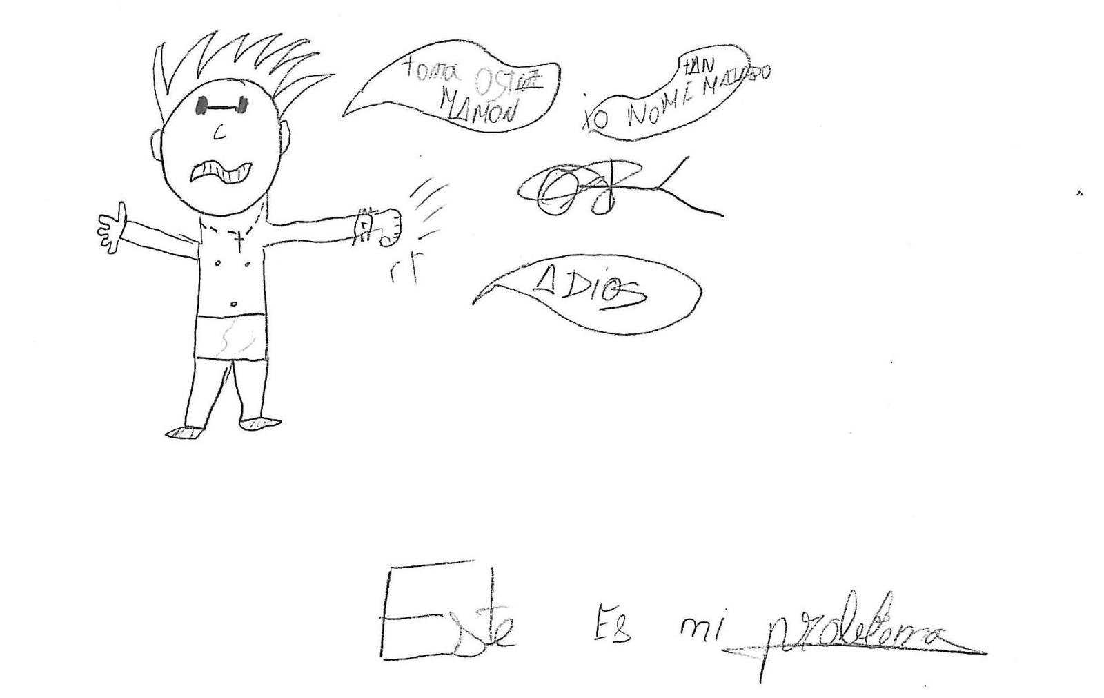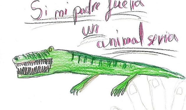 En otro dibujo, otro menor ha pintado un cocodrilo mostrando todos sus dientes en actitud fiera y amenazante, precedido de un texto que dice: «Si mi padre fuera un animal, sería...».