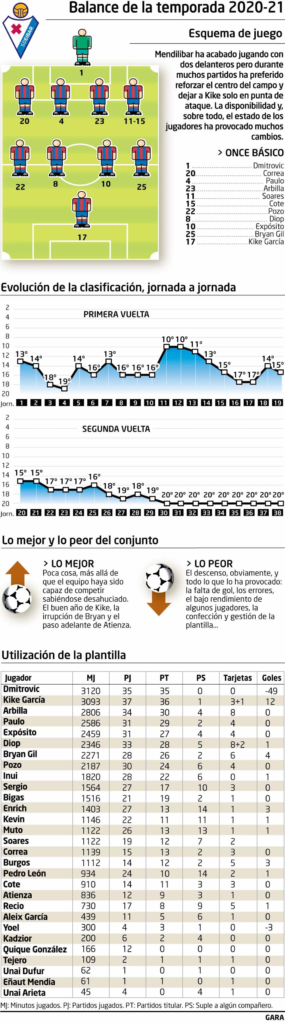 Tampoco José Luis Mendilibar ha tenido su mejor año. Ha necesitado demasiado tiempo para que el equipo plasmara sus ideas. Y tampoco, como alternativa, se ha amoldado a lo que las características de sus jugadores podían exigir. El resultado es que el «Eibar de Mendilibar» se ha visto con cuentagotas y solo ha tenido continuidad en las últimas semanas, cuando su racha de 16 partidos sin ganar ya le había sentenciado.