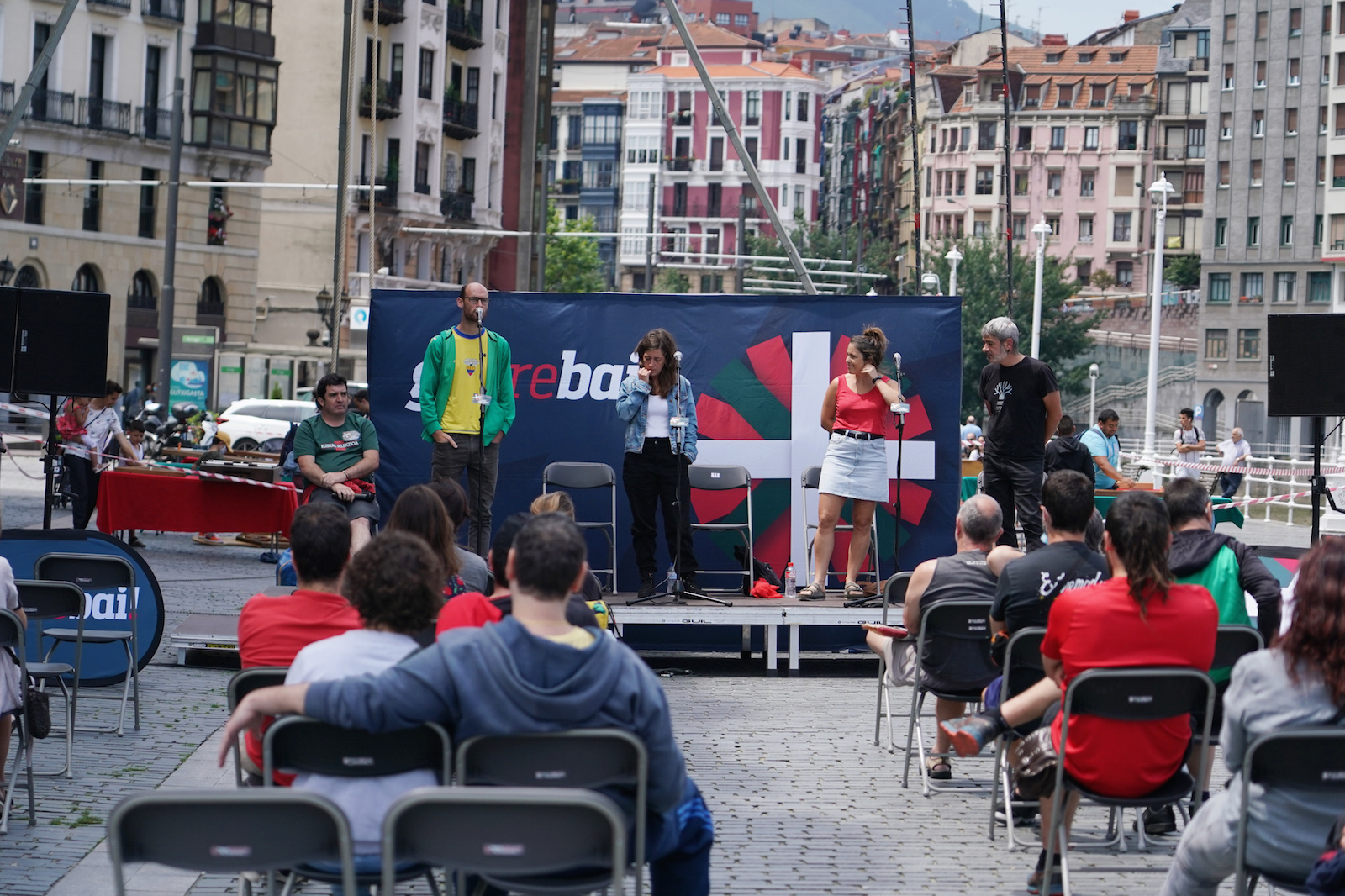 Seguimos en el Arenal, y en el lateral del Arriaga comienza un bertso saio que forma parte de los actos convocados durante toda la jornada de hoy para reivindicar la oficialidad de la selección vasca, bajo el lema ‘Euskal selekzioa, ofizialtasuna! Euskal Herritik mundura!’. El público, sentado, con distancia de seguridad y sin mascarillas... algunos, porque que se pueda quitar no significa que haya que hacerlo obligatoriamente.