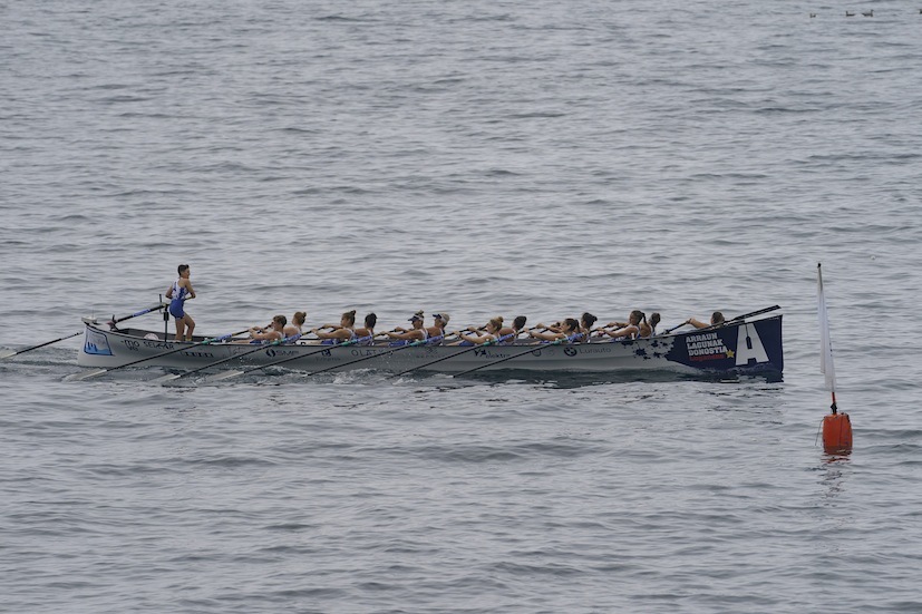 El viento ha querido ser jugueton, con ráfagas de hasta 30 kilómetros por hora, como juguetonas han estado las dos patronas de cabeza, arrimando sus palas más de la cuenta hasta que los jeces han ordenado a la patrona de Orio –y a la de Arraun Lagunak– para retirarse cada cual a su calle y evitar un choque que ha estado muy cerca de producirse.