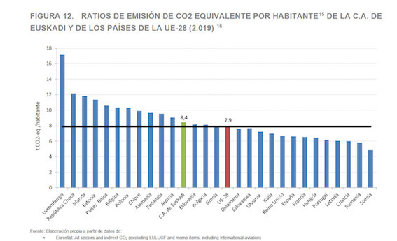 Según ha podido comprobar NAIZ en el último "Inventario de Emisiones de Gases de Efecto Invernadero del País Vasco" publicado por Ihobe, correspondiente al año 2019, se puede comprobar en la página 31 que el ratio de emisión de CO2 equivalente por habitante en la CAV es de 8,4 toneladas, mientras que la media de la UE-28 es de 7,9 toneladas.