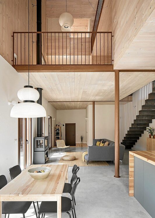 Una casa de pueblo. La casa MDN, de los ya citados Nook Architects, lidia precisa y magistralmente con esa estética feísta de los pueblos. Lo hace desde la principal herramienta que tiene la arquitectura: el volumen construido. La casa, ubicada en un pequeño pueblo del interior de Catalunya, en el Alto Penedés, se construye para una familia que se muda a esa localidad buscando el cambio de ritmo y el proyecto educativo e innovador de la escuela local. Los propietarios compran dos parcelas, donde se supone que tienen que ir dos viviendas entre medianeras, pero construyen una sola. De ese modo, pueden tener una tercera fachada a la que abrir ventanas. Sin embargo, la normativa indica que el perímetro íntegro de las dos parcelas debe de ser construido, con lo que se plantea un muro perimetral, a modo de zócalo, que cierra la parcela y obra de puerta de garaje. La proporción que se crea entre los dos elementos, el volumen vertical, y los huecos de las ventanas de este último, llama a la vez a la casa del pueblo de un modo no inventado, sino reinterpretado. Escalofrío, desaparecido.