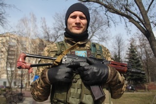 «Participé activamente en las protestas de Maidán y desde el estallido del conflicto del Donbás en 2014 estoy mentalmente preparado para la guerra, pero aún no física ni tácticamente», explica este joven risueño mientras hace hincapié en que cuando tenga la experiencia suficiente le gustaría ser mandado al frente. «Los primeros días del ataque ruso a finales de febrero simplemente me dediqué a fijar y proteger las ventanas con cinta adhesiva y ver cómo evolucionaba todo. Entre mi grupo de amigos creció el sentimiento de que había que hacer algo y nos unimos a las Defensas Territoriales».