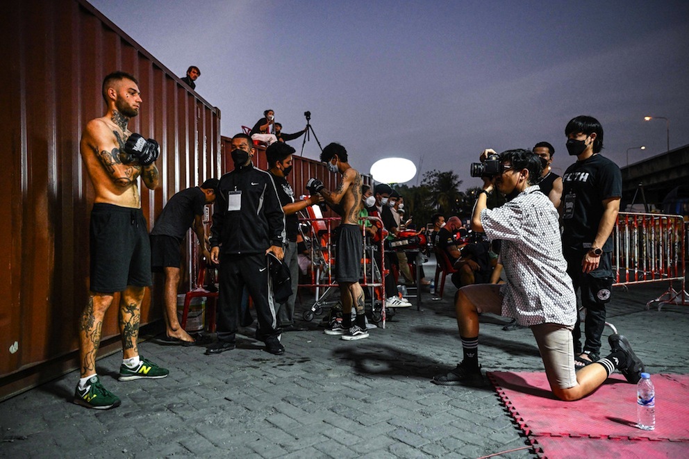 Aunque el duelo parece un combate de boxeo especialmente frenético, el decorado –rodeado de contenedores de mercancías en un barrio pobre cercano al puerto de la capital del país– está lejos de los deslumbrantes estadios del muay thai, el boxeo tailandés.