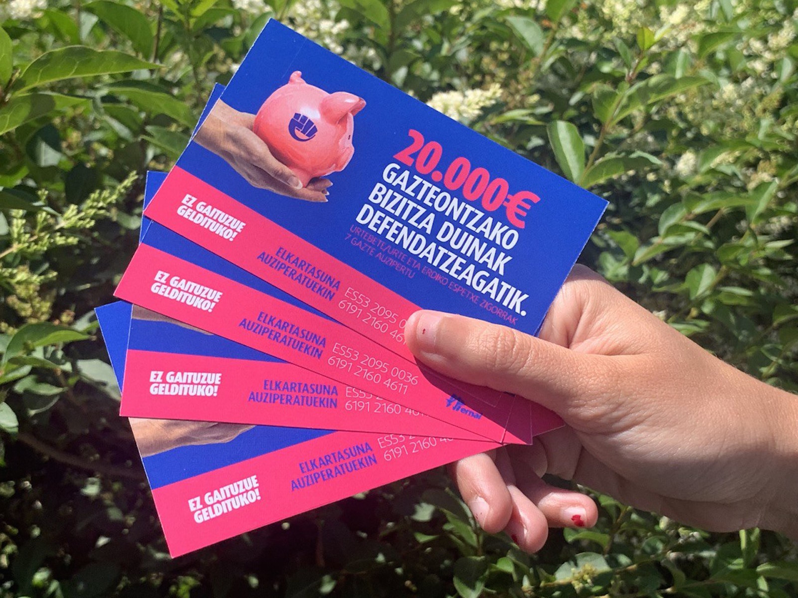 Hori dela-eta, kontu korronte bat ireki du gazte antolakundeak, herritarrek ekarpena egin dezaten: ES53 2095 0036 6191 2160 4611. Epaiketaren gastuetarako eta isun eta kalte ordainei aurre egiteko erabiliko dute bildutako dirua.