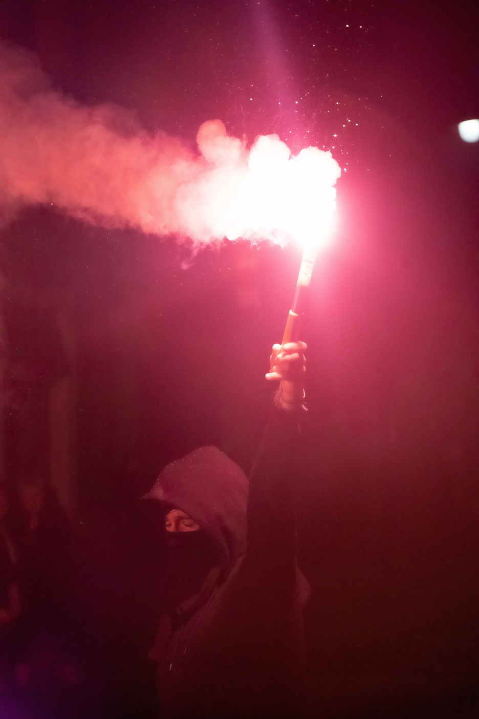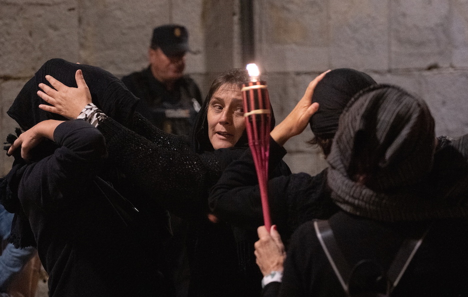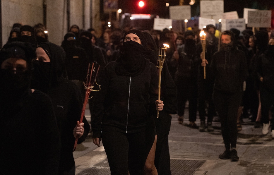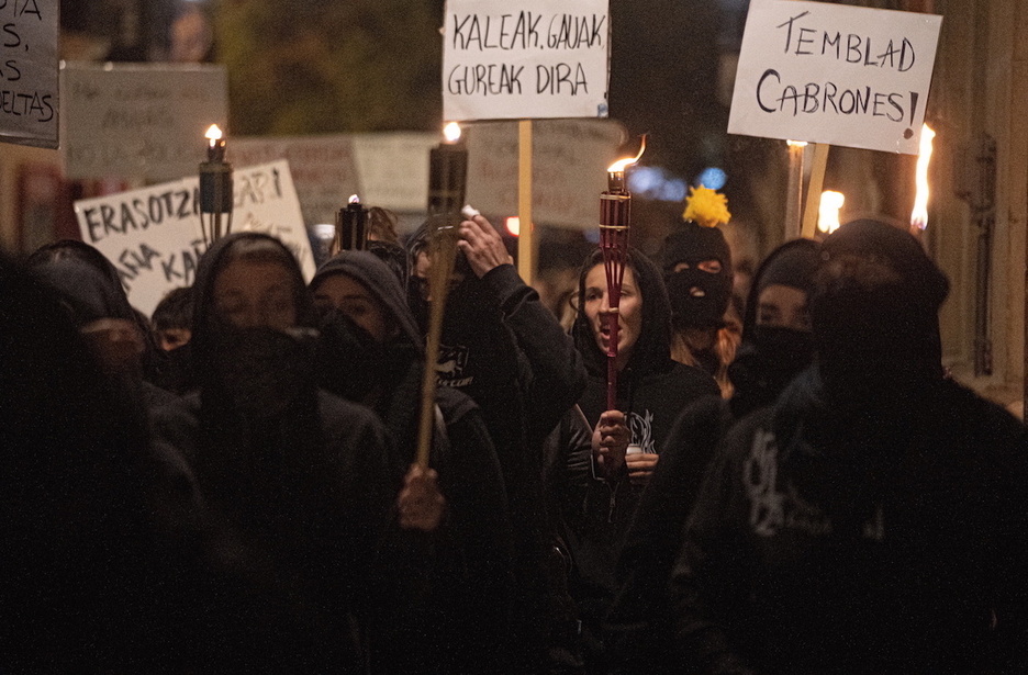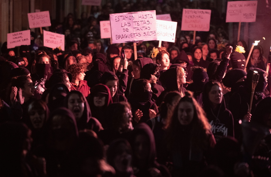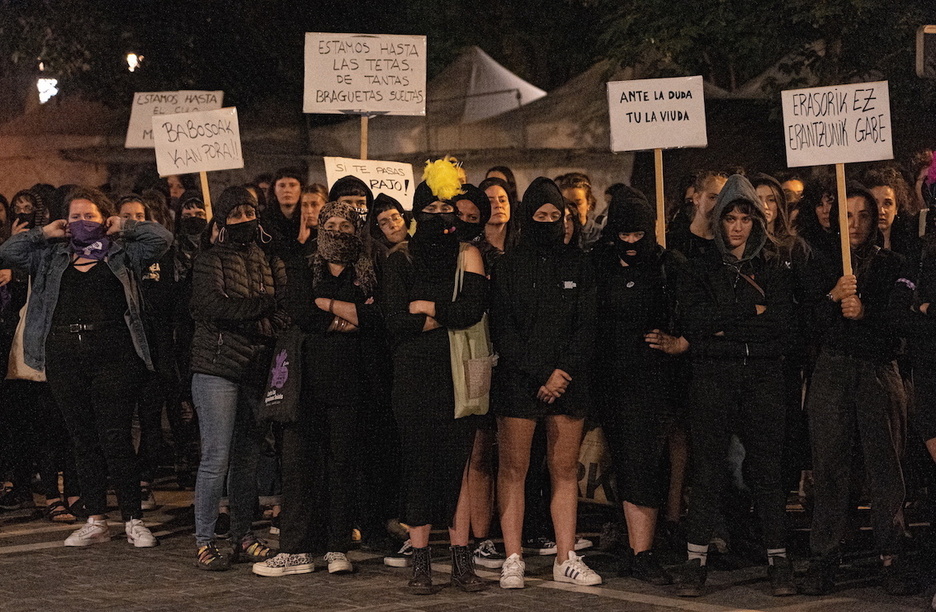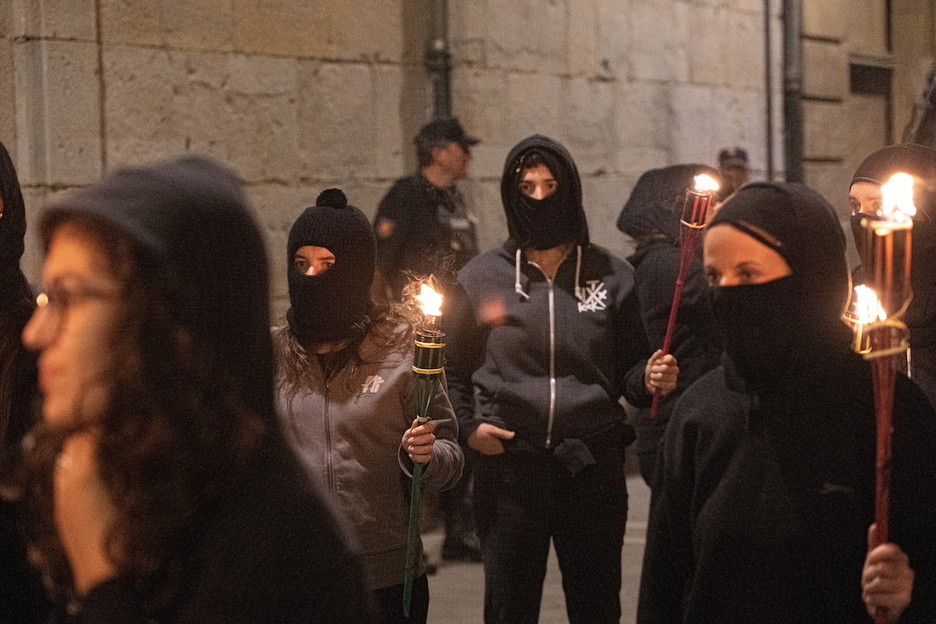 Beltzez jantzita egin dute bidea gehienek, zuziak eskuetan zenbaitek eta aurpegia estalia batzuk, mezu hauek erakutsiz: ‘Kaleak gureak dira’, ‘Temblad cabrones’, ‘Estamos hasta las tetas de tantas braguetas sueltas’, ‘Babosoak kanpora’, ‘Erasorik ez erantzunik gabe’, ‘Ante la duda, tú la viuda’... ‘Matxiruloen’ aurkako oihuak entzun dira.