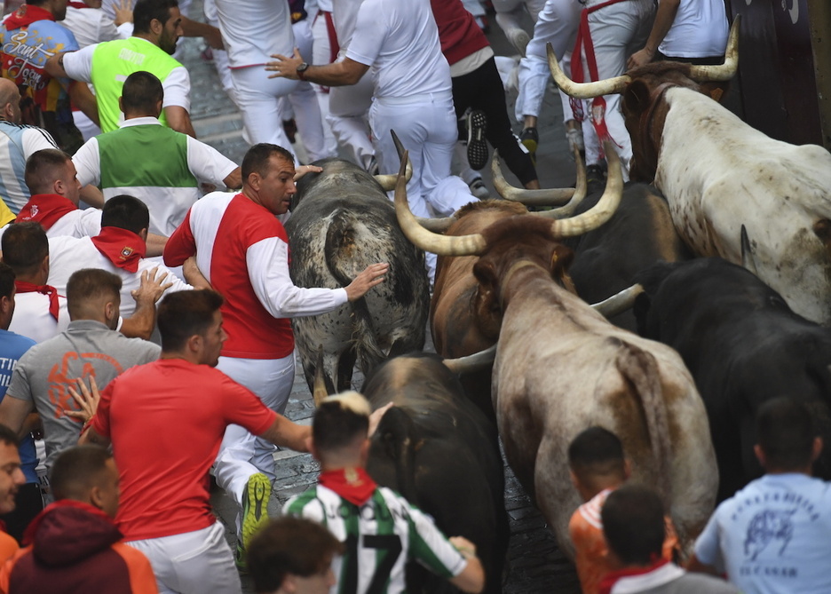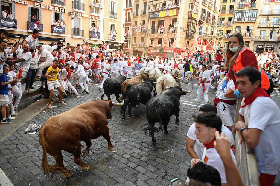 Los morlacos han tomado sin problemas la curva de Estafeta, donde se han reagrupado. Entonces, uno de los mansos de Macua se ha caído, lo que ha permitido a los toros hacerse con las primeras posiciones.