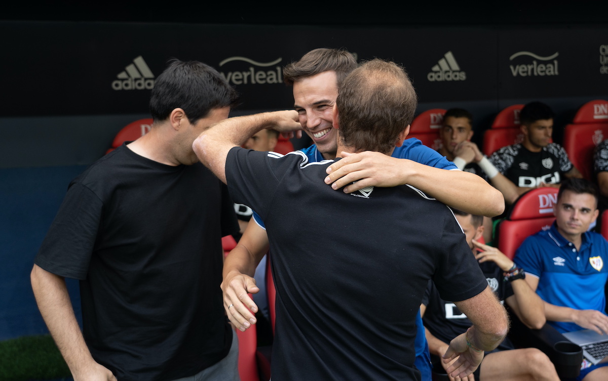 Iñigo Pérez, segundo de Iraola, se saluda con Arrasate en El Sadar. (Jagoba MANTEROLA / FOKU)