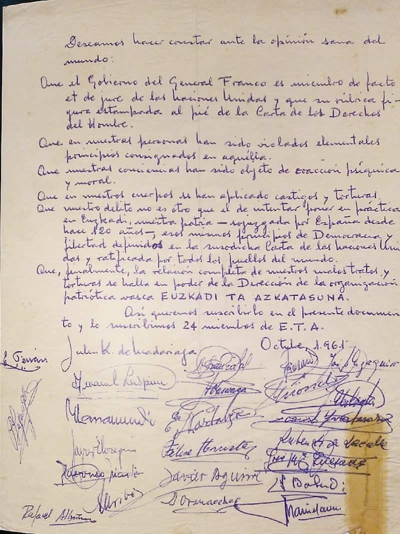 Bortizki torturatu zuten militante donostiarra, kasurako, lurrean jarritako beiraren gainetik belauniko ibiltzera derrigortuz. Beste 23 kiderekin batera, Gobernu frankistaren indar polizialen partetik jasotako tratu txar eta torturak salatu zituen 1961eko urrian idatzitako eskutitz baten bidez. «Francoren Gobernua Nazio Batuen kide da eta bere sinadura ageri da Gizonen Eskubideen Kartan», eta «guregan urratuak izan dira bertan jasotzen diren oinarriak», oroitarazten zuten eskutitzean.