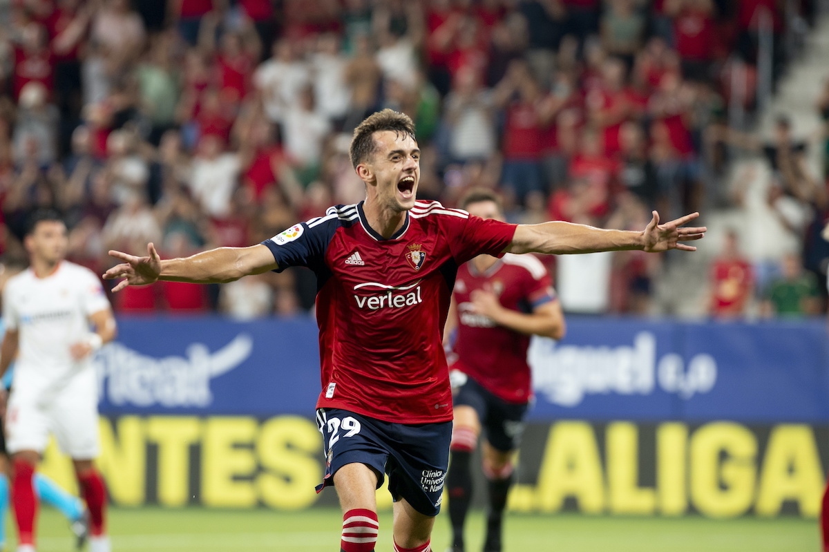 Aimar Oroz celebra el gol de la victoria contra el Sevilla. (Iñigo URIZ)