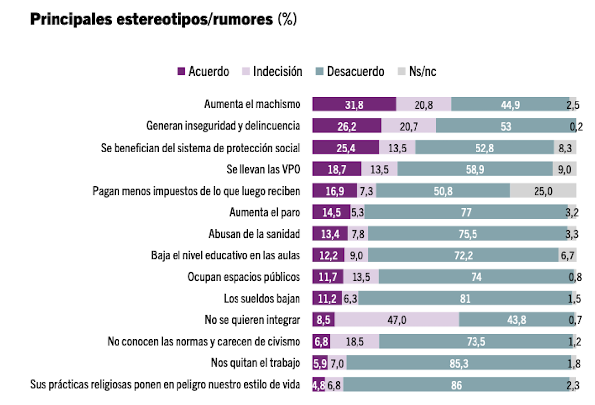 En este sentido, cabe destacar que los rumores y los estereotipos falsos sobre la inmigración siguen perdiendo peso y cada vez tienen menor presencia y apoyo social. Año a año, rumores como que se aprovechan del sistema de protección social o que se llevan todas las VPO van perdiendo fuerza y ya son más las personas que rechazan este tipo de afirmaciones que quienes las defienden.