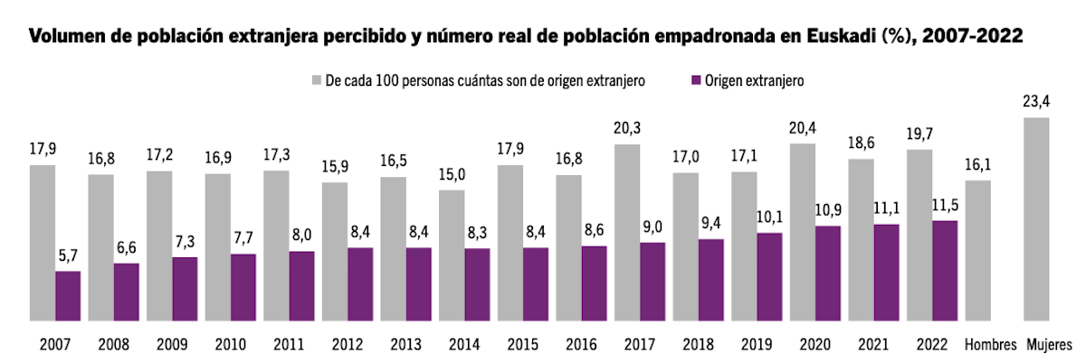 Los resultados del Barómetro 2022 muestran cómo la sociedad tiene una percepción sobredimensionada del volumen de población de origen extranjero residente. Entre 2021 y 2022, la población de origen extranjero empadronada en la CAV ha crecido hasta el 11,5%, mientras que la percepción de la población vasca se sitúa en el 19,7%.