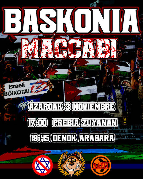 El Maccabi de Tel Aviv, uno de los «embajadores» más señeros del estado de Israel, regresa como cada año a Gasteiz a disoutar su partido de Euroliga. Por ello, la campaña internacional BDS – Boicot, Desinversiones y Sanciones contra el régimen israelí–, junto con Iraultza 1921 e Indar Baskonia, realizó el miércoles una concentración para «llamar a la ciudadanía de Gasteiz» a que se sume a la repulsa por la presencia del equipo israelí, «principal embajador deportivo del régimen de apartheid».