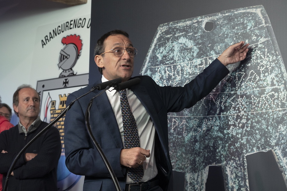 Una vez despejado ese espacio, se celebró una reunión exprés entre la restauradora, los técnicos del Gobierno de Nafarroa y el propio Aiestaran. Un encuentro en el que se «decidió contactar con algún experto en escritura paleohispánica y en Navarra, el mayor erudito en este tipo de cuestiones es Javier Velaza, catedrático de Filología Latina de la Universidad de Barcelona».
