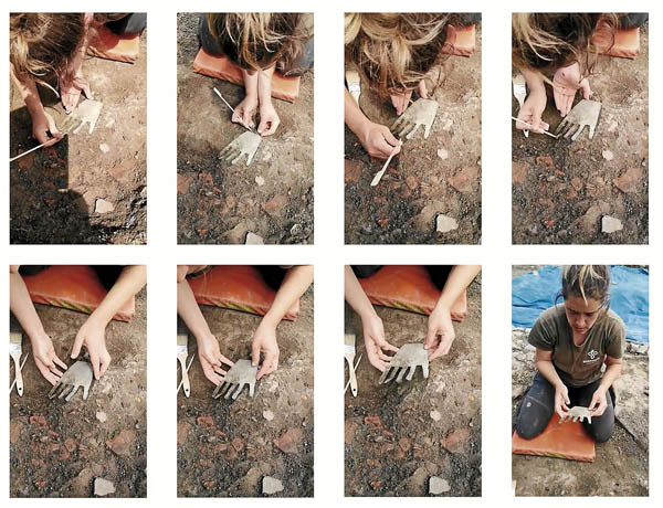 Siguiendo el protocolo establecido en estos casos, se sacó una primera fotografía antes de seguir adelante con la extracción protegiendo la pieza del sol con una sombrilla y siguiendo casi un procedimiento de cirujano al emplear material más pequeño, como palillos. Esa placa poco a poco empezó a presentar cinco puntas y se pudo apreciar que era «una pieza más grande, delicada, porque era una chapa muy fina», señala su descubridora.