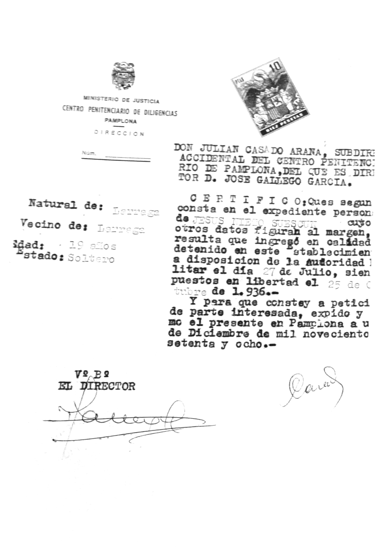 «Les daban la libertad. Tengo los certificados de casi todos los de Larraga. Los he recuperado. El de mi tío también, el del hermano de mi padre. Se llamaba como yo, Jesús Nieto. Tenía 19 años y era sindicalista de la CNT». Tras buscar el papel en una carpeta azul, el familiar de fusilado envía una copia a este medio del comunicado que, en 1978, le entregó Instituciones Penitenciarias lavándose las manos. No es cosa suya, su tío fue oficialmente liberado.