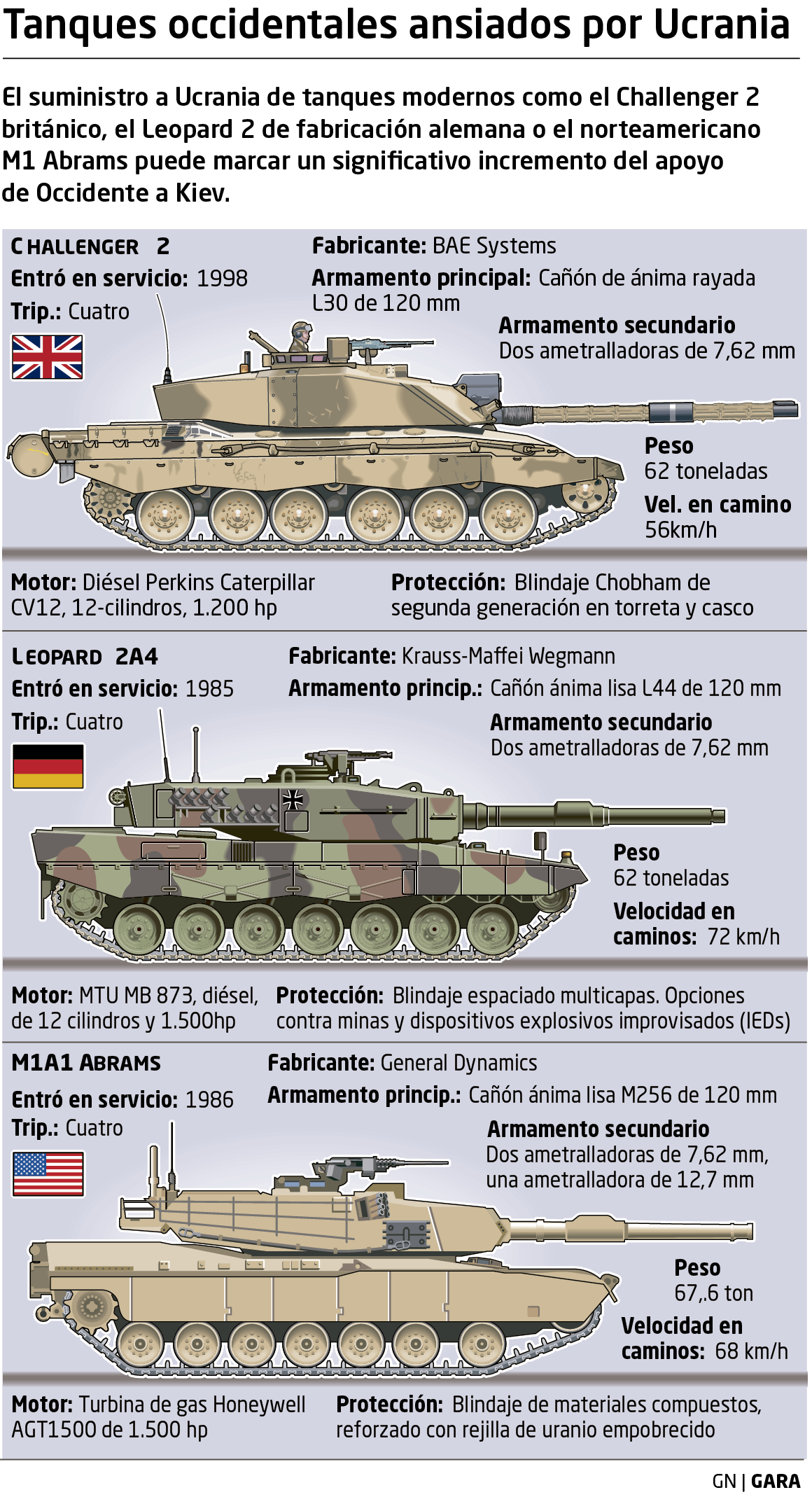 Los Abrams estadounidenses, que funcionan con queroseno y cuyo mantenimiento es más complejo, podrían tardar hasta un año. Hay quien asegura que la promesa de Biden de entregar los tanques «asesinos», capaces de disparar con uranio empobrecido, es más diplomática que militar.