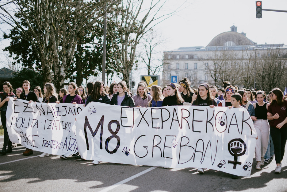Ya por la tarde, la manifestación de Baiona fue la primera en arrancar, desde la plaza del Mercado, desde donde marcharon hacia el centro para regresar luego a Baiona Ttipia. La manifestación terminó con cierto carácter festivo y se celebró una «aperitifa feminista» a modo de cierre.